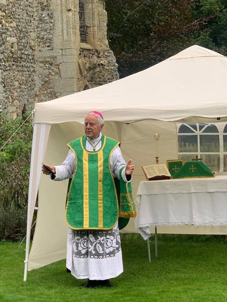 Bishop Williamson preaching at the Mass in the grounds of Walsingham Abbey.