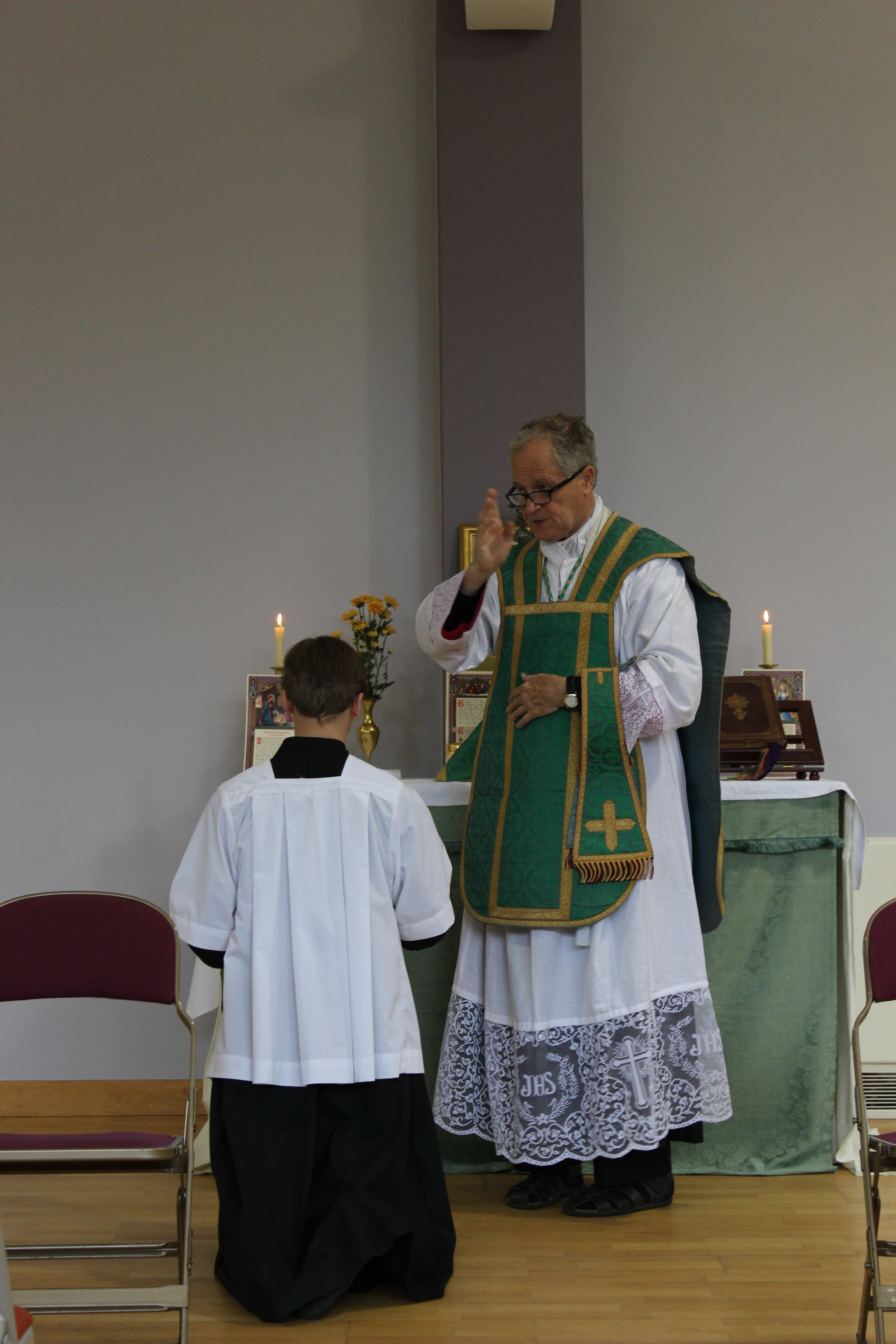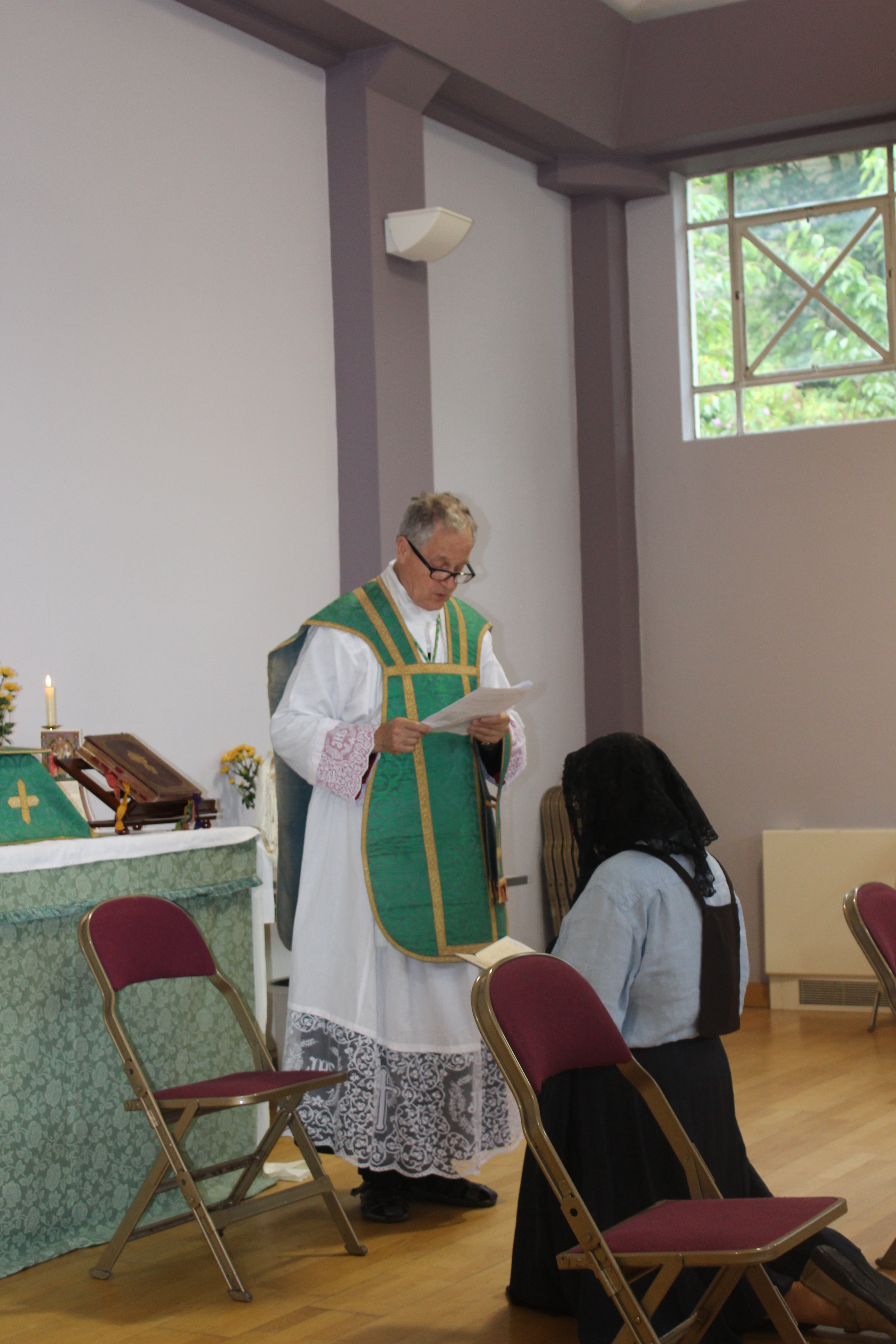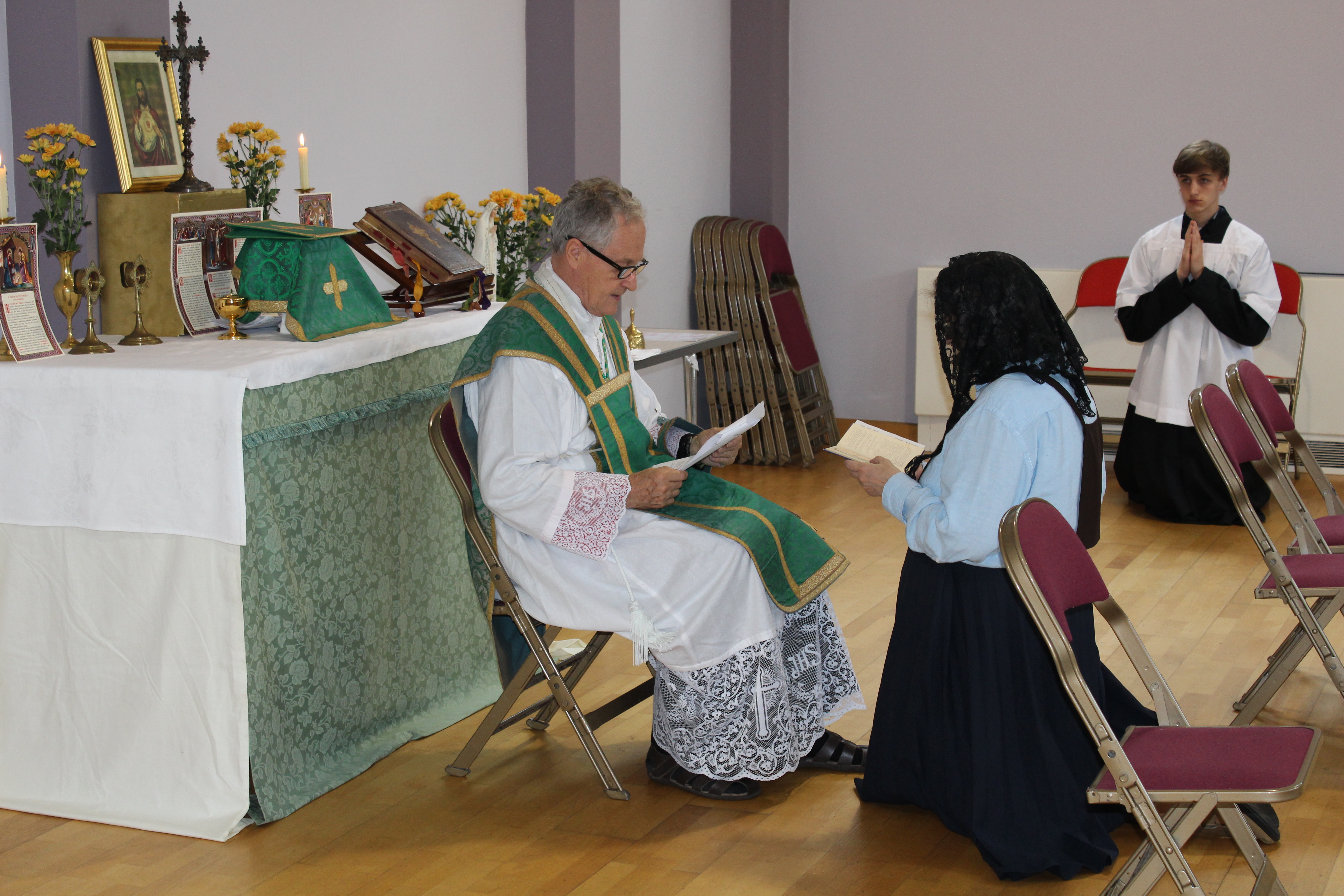 We were honoured and blessed to have His Lordship Bishop Faure come to say Mass especially for us in Earlsfield on Sunday 26th July, the feast of St Anne, with the encouragement of Bishop Williamson. After Mass, the 30 or so faithful present were able to witness the Profession of a Discalced Carmelite tertiary who had the rare privilege of being received as a novice by Bishop Williamson and then professed by Bishop Faure.