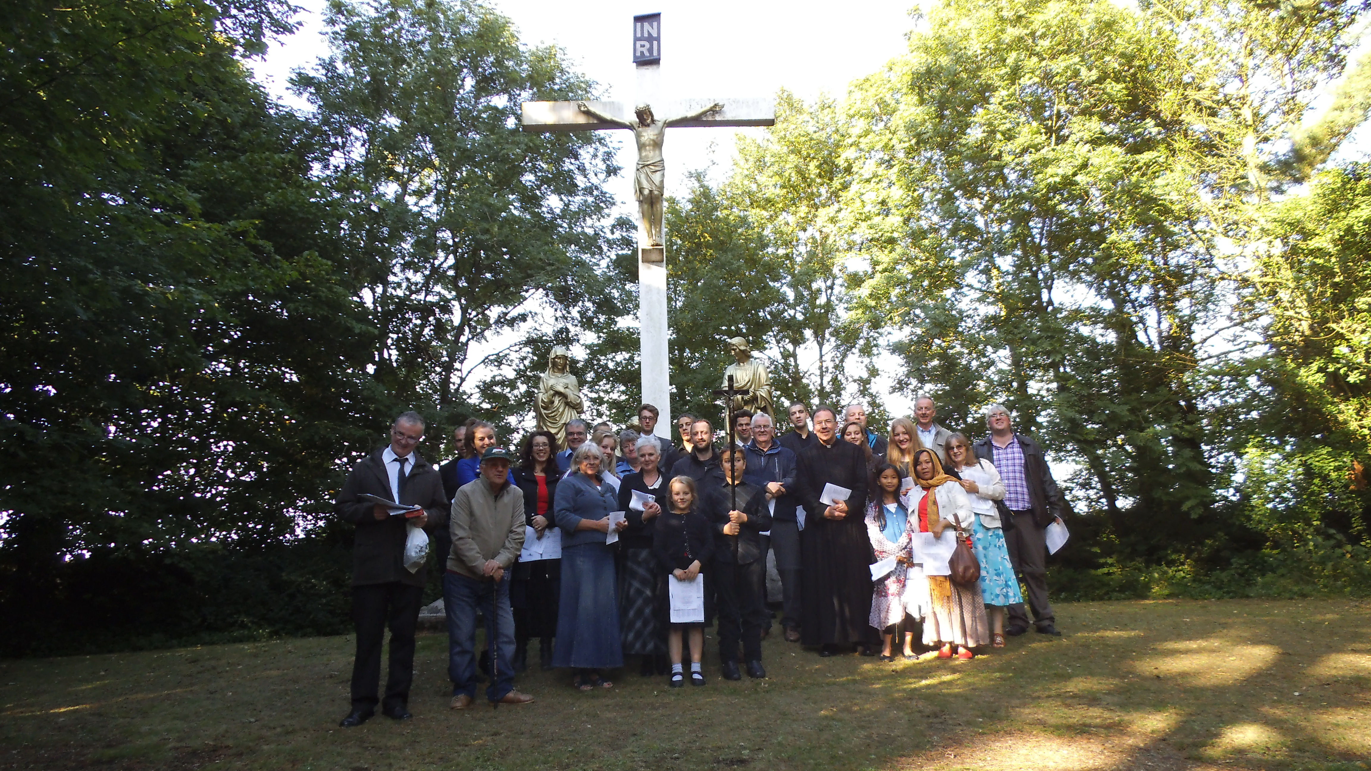 Our friends in the North led by Fr King undertook a pilgrimage to Holywell last weekend. There were about 45 pilgrims. The day began with the veneration of St Winifrede’s relic followed by the rosary at the Well. Holy Mass was then celebrated at a hall nearby and the pilgrimage ended with the Stations of the Cross. The photo below shows some of the pilgrims at the Calvary at the end of the Stations.