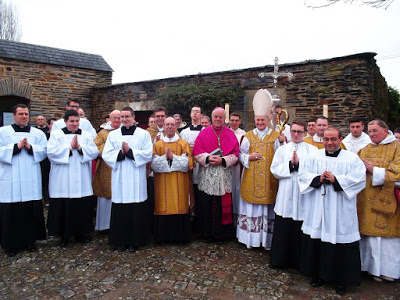 Today in the church at the Dominican Friary at Avrille, six seminarians (three French, one English, one Brazilian and one Italian) from the Seminary of St Louis de Montfort received the cassock during the Pontifical Mass celebrated by His Lordship Bishop Faure with Bishop Williamson in attendance.